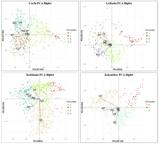 The first two PCA axes explained 75.4% of the ES variability for Corfu, 73.1% for Lefkada, 77.5% for Kefalonia, and 77% for Zakynthos, respectively. The first gradient in Corfu corresponded to an axis that ranged from olives with high recreation supply to low ES supply. The second gradient was identified an axis from cultivated crops to areas with high recreation (Figure 8). The first gradient on Lefkada ranged from mixed olives with high recreation to low ES supply, while the second gradient presented a variation from diverse landscapes of high recreation to olive crop provision. The first axis, identified in Kefalonia, represented a forest recreation to low ES supply gradient, while the second gradient showed an agricultural to erosion prevention gradient. Finally, the gradients identified on Zakynthos were associated with an agricultural to low ES supply (PC axis 1) and recreation to cultivated crops (PC axis 2).