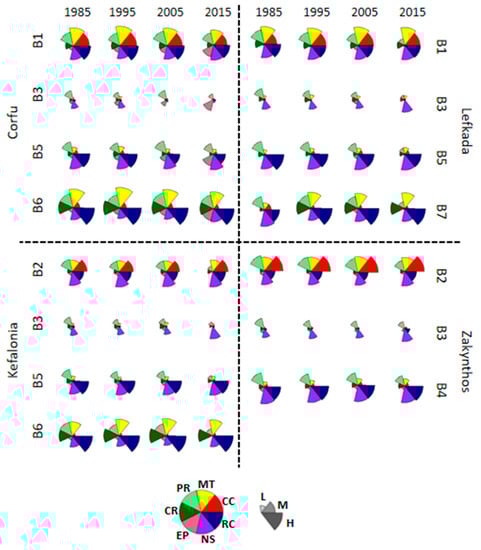 In Table 3, the spatial changes of ES bundles over time are presented with the area percentage for each studied year. B1 and B2 (crop related bundles) remained stable over time except in Lefkada where the areas covered with olive groves declined 10% with a subsequent increase of B5. B3 decreased in Corfu and Lefkada and increased in Zakynthos, while in Kefalonia remained relatively similar. B4 had a depletion of 5% from its original state in 2015. B6 in Corfu increased throughout all of the studied years, as well as in Kefalonia between 1985–2005. However, in 2015, B6 in Kefalonia decreased by almost 4%. The last bundle (B7) represented areas with high naturalness, due to the existence of forest, shrubbery, and high-density olives, which decreased by 13% between 1985 and 1995, but then increased to 17% in 2015.