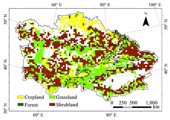 Central Asia has four dominant vegetation types, namely, forest, cropland, shrubland, and grassland. The differences in water supply and nutrients among these types result in possible differences in biogeochemical processes and carbon dynamics. Therefore, different vegetation types are expected to respond differently to climate variability and change. As forests are considered to be a significant carbon sink under changing climate and occupy large fractions of global terrestrial carbon, their carbon dynamics are of great importance. Agroecosystem can be a large source of carbon emission in the consideration of many cropland practices [7]; however, cropland in Central Asia is classified as irrigated cropland and rainfed cropland, which could lead to different carbon dynamics arising [8]. Shrubland ecosystems are widely distributed in both arid and semi-arid regions, and their carbon uptake/release are controlled mainly by water availability [9,10,11]. Many prior works have shown that shrublands have different growth patterns distinguishing them from other vegetation types [12,13]. Degradation of grassland is a predominant issue for Central Asia, and this can be attributed to climate change and grazing. Grazing alters grassland carbon stocks by stimulating regrowth of plant or just reducing above-ground biomass [14,15]. Therefore, grassland carbon cycling is not only affected by climate variation, but also by human activity.