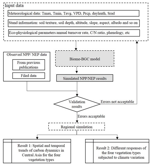 In order to testify that this model is practically feasible, model validation should be performed at the beginning of the analysis. Model validation is the process of evaluating the consistency and accuracy of the modeled results relative to field measurements. Biome-BGC has been assessed by performing sensitivity analyses [35] and validations against measured data, including forest [36,37,38], cropland [21], grassland [22,39], and all ecosystems [40]. In this study, we used field data collected from previous studies to evaluate the model’s performance in predicting NPP dynamics (as shown in Table 1 for supporting information). NEP was validated using eddy covariance data from Fukang Station of Desert Ecology, Chinese Academy of Sciences. All the procedures are shown in Figure 2.