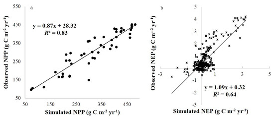 Comparison of simulated and observed NPP (a) and NEP (b).