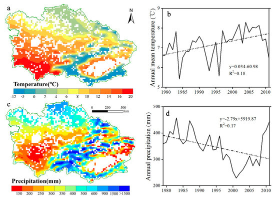 The climate data showed that Central Asia experienced a rise in annual mean temperature and decline in precipitation from 1979 to 2011 (Figure 4b–d). The results from linear fitting analysis showed that the region’s annual mean temperatures slightly increased at an average rate of 0.34 °C decade−1 from 1979 to 2011 (Figure 4a). This rate was higher than the average warming rates of 0.30 decade−1 and 0.15 decade−1 in the last five decades (1960–2011) and 11 decades (1901–2009), respectively (Hu, Zhang, Hu and Tian [5]). For 1979–2011, the annual precipitation showed a decreasing trend at a rate of 2.79 mm yr−1 over the entire study area (Figure 4b).