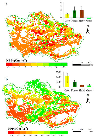 The results of NEP for the four vegetation types differed from NPP changes (Figure 5b). Grassland released carbon by by −0.21 gC m−2 yr−1, whereas the other three types were carbon sinks. Forest and shrub land had the highest carbon sequestration potential, and their NEP were 1.86 gC m−2 yr−1 and 1.91 gC m−2 yr−1, respectively. NEP for cropland was 0.86 gC m−2 yr−1, which presented as a weak carbon sink.