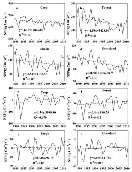Temporal distribution of NPP (a–d) and NEP (d–g) for cropland, forest, shrub, and grassland in Central Asia during 1979–2011.