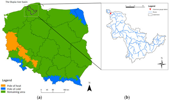 (a) Areas delimited as “pole of cold” and “pole of heat”; (b) modelling area—the Słupia River catchment.
