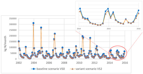 For the next “pole of cold” scenario (VS2), with shortening of the fertilization calendar, but without reduction of the fertilizer amount, the percentage of the TN load reduction was slightly lower compared to the VS1 scenario (5.96%). Dispersion for the VS2 results was at the similar level (737%), and the similar pattern was maintained for the seasonal changes. However, slightly lower ranges of the reduction for the summer (0.47–7.55%), and winter (5.94–12.05%) periods were detected (Table 2). The average TN loads both for summer and winter were also lower than those calculated for the VS1 scenario, by 0.2% and 3.59%, respectively. Comparing results of the VS2 with the baseline scenario the TN load average difference by 716 kg/month (cv = 72%) for the summer period, and 5049 kg/month (cv = 20%) for the winter period was concluded. As for the yearly pattern of the TN load distribution, the extreme values were detected in the same years as for the VS1 (2002–2003, and 2006) for the summer period. During the winter period the extreme values were observed in 2002 and 2012. Similarly, to the variant scenario VS1, also for VS2, the dependence of the TN load value on time remained the same (high values in the winter months and low in the summer months) (Figure 3). For the years 20014–2016, the lowest TN load was 4,810 kg/month (September 2014), while the highest TN load was 64,666 kg/month (December 2015), which again highlights the 15-times difference between winter and summer periods.