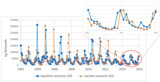 Extension of the fertilization period by 30 days (with maintaining the yearly fertilizer consumption) assumed in the “pole of heat” scenario (VS3) showed opposite trends. For the discussed pilot catchment such a change could result in a 43.69% increase of the TN load comparing to the baseline scenario. The reduction percentage for the VS3 compared to the VS0 scenario ranged between 67.77% and −145.09% (increase) for the summer period, and from 37.71% to −176.14% (increase) for the winter period (Table 2). Dispersion of the results was smaller than in the case of the VS1 and VS2 scenarios and amounted to 677%, and dramatic changes could be observed for the particular years (Figure 4). For the summer period the extreme values were observed for 2002, and 2004, while the contrasting (lowest-highest) values were detected for 2007, and 2008. The average TN values showed an increase by 2220 kg/month (cv = 520%) for the summer period, and by 1841 kg/month (cv = 1742%) for the winter period. Additionally, in the case of the variant VS3 scenario, the trend has been preserved for most years. In the case of this scenario, however, there is a clear difference in the TN load values obtained for selected months compared to the VS0 scenario. For the 2014–2016 period highlighted in Figure 4, the lowest TN load was about 4800 kg/month (September 2015), while the highest value (~107,000 kg/month) reached in January 2014. In comparison to the VS1 and VS2 scenarios, the difference between TN loads for summer and winter in the period 2014–2016 has even increased, being 26-times higher during the winter period.