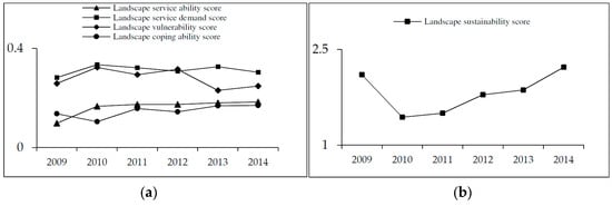 The landscape service ability score showed an upward trend from 2009 to 2014 (Figure 1a), indicating that the supporting capacity of the rural landscape system gradually increased. The landscape service demand score showed an increasing trend during the study period, indicating that the pressure of human activities on the rural landscape system increased and that the diversity and complexity of the system increased. The overall landscape vulnerability score showed a decreasing trend and the landscape response ability increased. This pattern indicated that the vulnerability of the landscape gradually decreased during the study period and that the capacity of the rural landscape system to resist disturbance increased steadily with an increase in investments in ecological environmental protection.