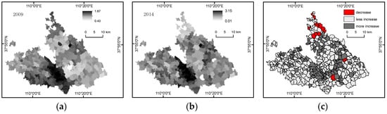 Figure 2a,b show that villages with a high landscape sustainability score were mainly concentrated in the middle of the study area. To show the spatial and temporal differentiation of landscape sustainability, ArcGIS 10.2 was used to calculate the change in landscape sustainability by subtracting the landscape sustainability score in 2014 from that in 2009 (Figure 2c). The landscape sustainability scores in 2014 were higher than those in 2009 for all but 11 villages (Figure 2c), and these 11 villages were mainly located in the northeast of the study area. With the natural breaks (Jenks) method, the villages with an increasing sustainability score were divided into two categories: those with a smaller increase and those with a larger increase. The villages with a larger increase were mainly distributed in the middle of the study area.