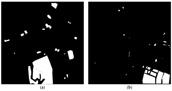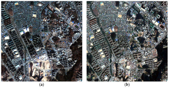 When the nadir angle of and is different, the spatial positions of some objects, such as apartments and high-rise buildings, are different due to relief displacement. When performing change detection using general sharpened images and , the objects or regions associated with the abovementioned spatial displacement may be detected as changed regions, and this issue poses a problem. Cross-sharpening has been applied to minimize spatial dissimilarities between multitemporal images caused by nadir angle and relief displacement differences, as defined in Equation (3) [18].