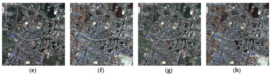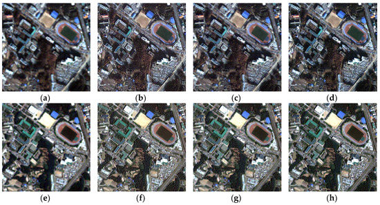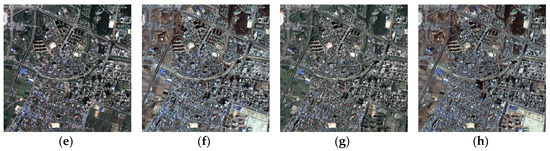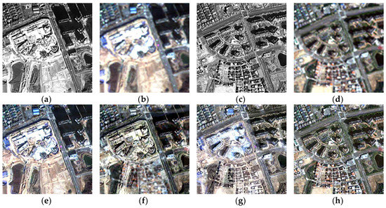 Detailed images of the sharpening results at Site 1: (a) panchromatic image at time 1, (b) multispectral image at time 1, (c) panchromatic image at time 2, (d) multispectral image at time 2, (e) , (f) , (g) , and (h) .
