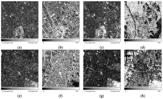 Results from the combination of the following data with the S2CVA method: (a) magnitude information using only pan-sharpened images of Site 1, (b) direction information using only pan-sharpened images of Site 1, (c) magnitude information using pan-sharpened and cross-sharpened images of Site 1, (d) direction information using pan-sharpened and cross-sharpened images of Site 1, (e) magnitude information using only pan-sharpened images of Site 2, (f) direction information using only pan-sharpened images of Site 2, (g) magnitude information using pan-sharpened and cross-sharpened images of Site 2, and (h) direction information using pan-sharpened and cross-sharpened images of Site 2.
