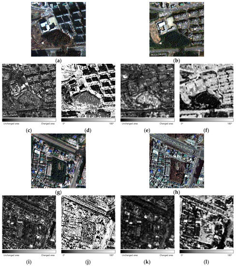 Detailed (400 × 400 pixels) S2CVA results: (a) pan-sharpened image at time 1 at Site 1, (b) pan-sharpened image at time 2 at Site 1, (c) magnitude using only pan-sharpened images of Site 1, (d) direction using only pan-sharpened images of Site 1, (e) magnitude using cross-sharpened images of Site 1, (f) direction using cross-sharpened images of Site 1, (g) pan-sharpened image at time 1 at Site 2, (h) pan-sharpened image at time 2 at Site 2, (i) magnitude using only pan-sharpened images of Site 2, (j) direction using only pan-sharpened images of Site 2, (k) magnitude using cross-sharpened images of Site 2, and (l) direction using cross-sharpened images of Site 2.