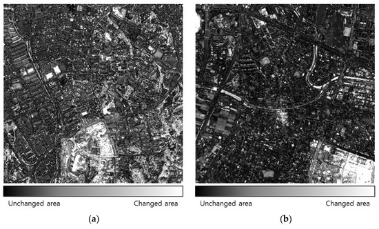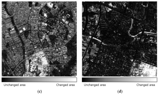 With the launch of various optical satellite sensors, such as KOMPSAT-2/3/3A, WorldView-2/3/4, Pléiades, and Skysat, remotely sensed satellite images are being increasingly used in different applications and fields [1]. Change detection is one such remote sensing application. It involves analyzing a changed area due to disasters, deforestation, hazards, and urban development by determining differences in the spatial and spectral characteristics among multitemporal satellite images of the area [2]. Specifically, change detection can be used in sustainable applications in environmental engineering, ecology, and urban sciences through Earth observations. Change detection can generally be of the supervised or unsupervised type. Supervised change detection involves classifying each satellite image and analyzing the change class using classification results [3]. However, it has some drawbacks; for example, high-accuracy classification data are required to obtain high-confidence change detection results, and user intervention is required when generating training datasets [4]. Therefore, unsupervised change detection has attracted increased interest in recent years. In this technique, multitemporal satellite images of the same area are analyzed to detect the presence or absence of changes without user intervention. Several unsupervised change detection methods applicable to satellite images with various spatial resolutions, such as image differencing, image rationing, image-transformation-based techniques and change vector analysis (CVA), have been developed [5]. Notably, CVA can be easily applied to various multitemporal satellite images using the magnitude and direction of the difference between multitemporal images to estimate the changed area [6]. CVA has also been extended to develop additional techniques. Chen et al. [7] extended CVA to calculate spectral vector directions in multispectral images. Carvalho Júnior et al. [8] extended the spectral measures used for remote sensing data analysis to CVA to effectively apply CVA to multispectral images. Wu et al. [9] demonstrated that subspace-based change detection (SCD) has the same characteristics as the spectral angle mapper (SAM) and extended SCD to adaptive SCD (ASCD) and local SCD (LSCD). Bovolo and Bruzzone [10] transformed the magnitude and direction of CVA into the polar domain and proposed a compressed CVA method (C2VA) to effectively extract the changed area in polar coordinates. The sequential spectral CVA (S2CVA) technique was developed to analyze the transition of a changed area and increase the change detection accuracy of CVA and C2VA [11]. S2CVA uses the same method as C2VA to estimate the magnitude of the spectral change vector; however, it uses the reference vector to calculate the direction of the spectral change vector. In S2CVA, the reference vector used to calculate the direction of the spectral change vector is assumed to be the vector with the highest weight in the spectral change vector, and it is calculated using the principal component of the spectral change vector.