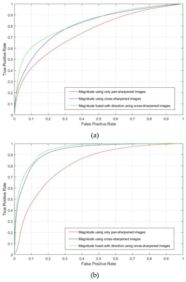 As shown in Figure 10c,d, the magnitude values of unchanged vegetation and complex urban areas decreased compared to those in Figure 10a,d. However, the change area displays high magnitude values. Therefore, false alarms that occur when performing change detection using the magnitude information of traditional S2CVA can be effectively reduced using the proposed technique. To evaluate the quantitative accuracy of the proposed change detection method, we compared the proposed magnitude information results obtained using cross-sharpened images with those obtained using only pan-sharpened images. Figure 11 and Table 5 show the ROC curve and AUC results according to the magnitude information based on ground truth data.