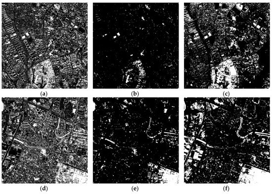 Binary change detection results based on threshold selection: (a) binary image using only pan-sharpened images of Site 1, (b) binary image using only the magnitude of cross-sharpened images of Site 1, (c) binary image using fused magnitude and the direction of cross-sharpened images of Site 1, (d) binary image using only pan-sharpened images of Site 2, (e) binary image using only the magnitude of cross-sharpened images of Site 2, and (f) binary image using fused magnitude and the direction of cross-sharpened images of Site 2.