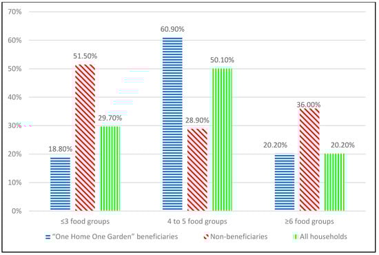 A Household Dietary Diversity Score was estimated so as to elicit a deeper understanding of the food groups consumed by households. The various food groups that different households consumed were used to compute the HDDS in a 24-h recall period. An independent samples t-test was performed to compare the status of household food security (proxied by the HDDS) of the two groups (that is, the “One Home One Garden” beneficiaries and non-beneficiaries) at a 0.05 significance level. The independent samples t-test (Levene’s test—equal variances assumed) revealed a significant relationship between the two sample groups and the status of household food security of t(493) = 4.156, α < 0.001. Thus, the null hypothesis was rejected and we concluded that there is a statistically significant difference between the food security status of the “One Home One Garden” beneficiaries and the non-beneficiary group (households). The results revealed that the mean HDDS was 4.67 for all households; the mean HDDS values were 4.89 and 4.22 for the “One Home One Garden” beneficiaries and non-beneficiaries, respectively (Table 4). The mean HDDS of the “One Home One Garden” beneficiaries was slightly higher than that of the total sample (all households), whereas the mean of the “One Home One Garden” non-beneficiaries was lower than the total sample mean. The HDDS results were further separated into three dietary classes; lowest diversity (three or less foods groups), medium diversity (between four and five food groups), and high diversity (six or more food groups). The results in Figure 2 revealed that the majority (about 50%) of the total sample—that is, about 61% of “One Home One Garden” beneficiaries versus 29% of the “One Home One Garden” non-beneficiaries—fell in the medium dietary diversity class/category (consumed four to five food groups). Furthermore, the results also revealed that the majority of all households—about 52% of the “One Home One Garden” beneficiaries versus about 19% of the “One Home One Garden” non-beneficiaries—consumed less than three food groups (classified as the lowest dietary diversity group). The justification for this finding could be that the “One Home One Garden” beneficiaries relied primarily on their own agricultural production and less on off-farm income such as government grants, whereas the “One Home One Garden” non-beneficiaries relied less on their own agricultural production and more on government social grants as food procurement sources (Table 4). Lastly, it is interesting from these results to note that the “One Home One Garden” non-beneficiaries in the high dietary consumption category constituted a larger proportion (36%), as compared to about 20% of the “One Home One Garden” beneficiaries. Nonetheless, on average the “One Home One Garden” beneficiaries had better food dietary diversity than the non-beneficiary households.