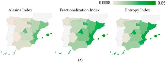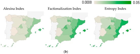 Figure 2. (a) Maps of the diversity indexes by regions in 2008; (b) maps of the diversity indexes by regions in 2016. Source: authors’ own elaboration based on INE data.