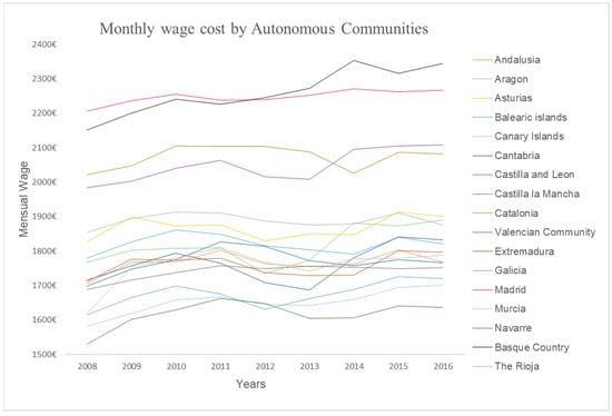 Figure 4. Monthly wage by regions. Source: Authors’ own elaboration based on INE data.