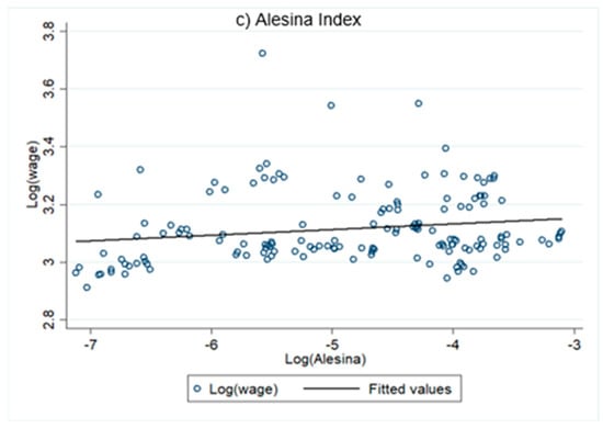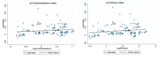 The foregoing stylized facts reveal that there has not only been a change in the migration inflows of Spain—it has gone from being a sending country to a receiving country—but also a qualitative change in terms of the diversity of the new residents. In general, as the descriptive evidence shows, those regions where we find higher wages or per capita income are also those with a greater presence of different nationalities. However, this is not always so, as in the case of Andalusia or the Valencian Community, with high rates of cultural diversity but levels of income per capita below the average. This is probably the reason why, although we find a positive correlation, on average, as shown by the upward slopes shown in Figure 5, where the log of wage is represented with respect to the different diversity indexes, this relationship is not too pronounced. In fact, the correlation coefficients obtained between the diversity indexes and wages do not exceed 0.2 in any case.