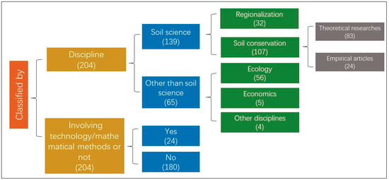 By keyword searching, the top 10 most highly cited articles were selected. As Figure 1 illustrates, the top 10 articles were collectively cited 204 times, excluding self-citations and repeated citations. Classified by discipline, they were cited139 times by articles on soil science, among which 32 articles were on the regionalization of soil and water conservation at different scales (e.g., province, city or watershed), another 107 were research on soil conservation, including 83 theoretical research works mainly concerning the benefit of soil conservation, and 24 empirical articles mostly were on the experience of soil erosion management. The other 65 articles of the total of 204 were on regionalization in general use within different research fields, especially in ecology (mainly concerning ecological regionalization and ecological compensation). In addition, 24 articles of the total 204 concerned RS technology and mathematical methods, while the other 180 did not.