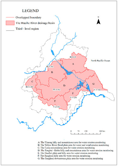 Soil erosion monitoring sites are distributed according to regionalization [49]. In China, the existing monitoring system of soil erosion consists of one national monitoring center run by MWR, seven regional monitoring centers run by the Conservancy Commissions of the seven main rivers and 30 provincial monitoring centers run by provincial water resources departments. The 483 monitoring sites under the supervision of these 38 centers are generally evenly distributed in the 41 sub-regions divided by the national regionalization of soil and water conservation. Another case is as illustrated in Figure 3: in order for soil erosion to be systematically monitored, the Huaihe River drainage basin was divided into seven monitoring regions, the boundaries of which are exactly similar to the boundaries of the soil and water conservation third-level regions [50].