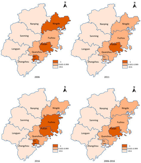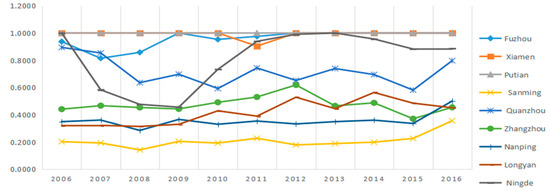 This study uses Max DEA PRO 6.0 software to measure the industrial eco-efficiency values of nine cities in Fujian Province from 2006 to 2016. The result are summarized in Table 4 and the visualized results are provided in Figure 1 and Figure 2.