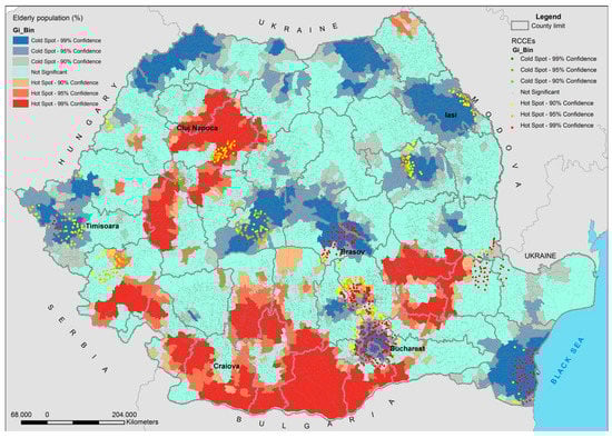 Clusters map of the elderly population in Romania (2016) and the number of accommodated people in public and NGO residential centres (2016). Hot Spot Analysis in ArcView, 10.3.1. Data sources: ([55]; MLSJ, 2014, 2016).
