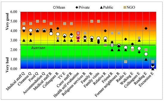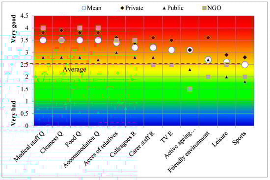 The first social dimension refers to the quality of essential services (medical assistance, accommodation, food, and cleanliness). All RCCEs included in the study fulfil the minimum criteria of services/logistics [13], however, regarding the perception of the two sample groups on care services provided, we found that S1 considers them as “very good” while S2 was just “good”. Moreover, NGO RCCEs are very highly appreciated, followed by private RCCEs, whereas the lowest ratings were given to public centres, with one-point Likert scale difference between the two groups (Figure 2 and Figure 3).