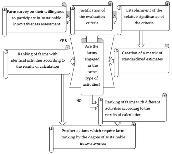 The assessment methodology was expressed through the farm innovativeness assessment model. The suggested farm innovativeness assessment model represents a flexible system which enables, depending on the measurement objective, to assess farms engaged in the same type of activities or farms with different activities and to rank them according to the relative index of innovativeness. The article provides a justification for the objectives of sustainable innovativeness measuring in farms engaged in either the same or different activities. The model includes the following components: Farm survey on their willingness and possibilities to participate in innovation assessment, justification of the evaluation criteria, establishment of the relative importance of the criteria, creation of a matrix of standardised estimates, ranking of farms according to the results of calculation depending on the measurement objective (the farms included into the assessment can be engaged in the same or different types of business), and further actions where farm ranking by the degree of sustainable innovation is needed.