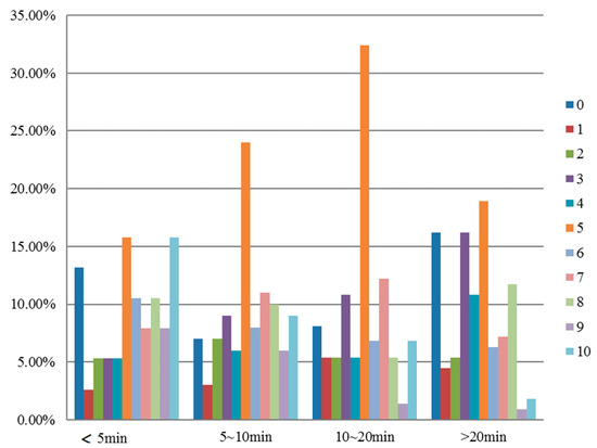 For patients who queued up for the payment within 5 min, were satisfied with the service (rating score ranged from 5 to 10 points). However, there was still a number of patients (13.2%) who were extremely dissatisfied with the waiting time for payment. Most patients had moderate degrees of satisfaction when the waiting time ranged from 5 to 20 min, while the number of dissatisfied patients was less than that in the former case. When the waiting time was more than 20 min, more patients (16.2%) were dissatisfied. The sensitivity is not strong because the queuing time for payment was generally much less than that of the treatment. Therefore, it would be suitable to control the queuing time for payment between 5 and 10 min if the hospitals were able to do the coordination.