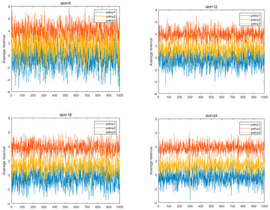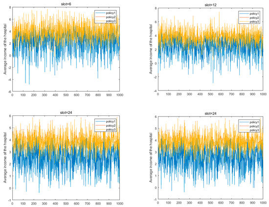 According to the Figure 7, the optimal strategy (strategy 1) for patient satisfaction target is set, the optimal strategy (strategy 2) for hospital revenue target is set, and the optimal strategy (strategy 3) for a balanced target is set. After 1000 service days, the average benefits of the three optimal strategies in the four slots under their respective measurement indexes are obtained.