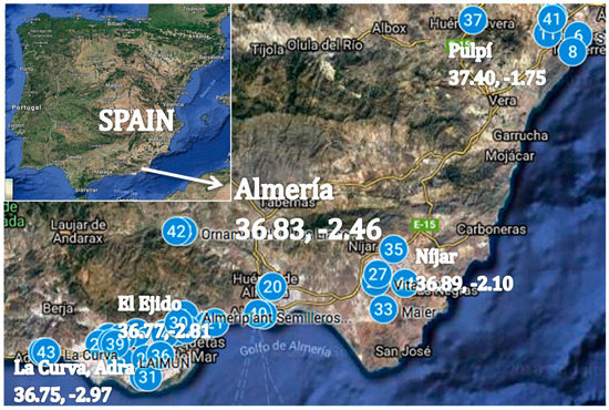 Before conducting the experiment, we carried out a survey in local horticultural seedling nurseries (50 enterprises) (Figure 1) in southern Spain to determine which was the degree of lighting establishment in these nurseries as well as the main spectral characteristics of the lamps used for horticultural seedling production. The spectral quality data of each nursery was registered using a luxometer (GOSSEN MAVOLUX model 5032C USB; Casella., Madrid, Spain).