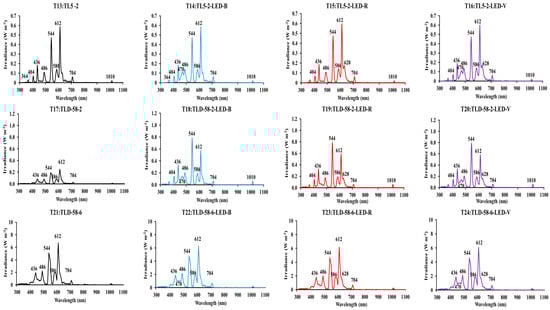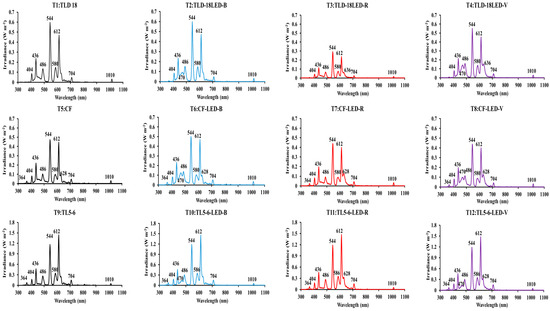 The main peaks observed in the different combinations of lamps and LEDs assessed revealed that they were in the photosynthetically active radiation (PAR) range, so they might affect the photomorphological aspects of the plant along with its development [29].