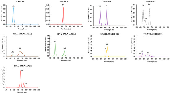 FL assessed showed common peaks at the following wavelengths: 436, 486, 544, 580, 612, 704 and 1010 nm. In addition, in some lamps, there was a pick in ultraviolet region (364 nm). Regarding LEDs, blue LEDs showed a peak at 470 nm, red LEDs at 636 and blue + red and white LEDS at 470 and 636 nm, respectively. The different stages in XTRASUN LEDs assessed were characterized as follows: GG showed two main peaks at 450 and 660 nm, VG at 430 and 660 nm, FP at 660 nm, whereas the ultraviolet (UV) had three main peaks at 405, 460 and 590 nm and the infrared (IR) at 660 and 745 nm (Figure 2).