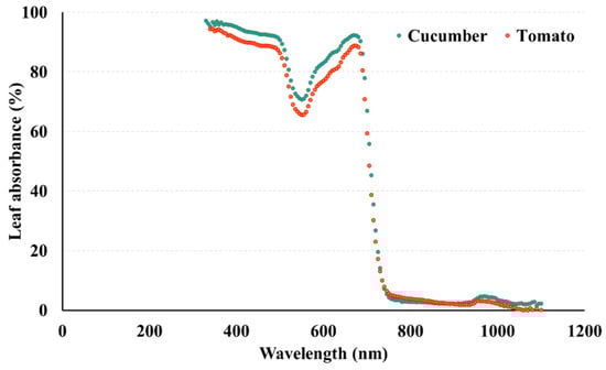 Leaf absorbance expressed in percentage of tomato and cucumber seedling plants.