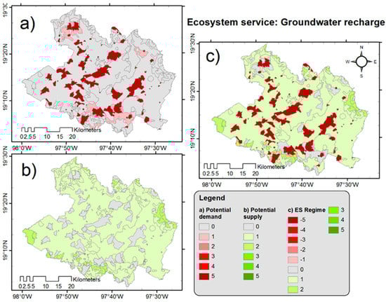 Demand (a), supply (b), and budget (c) of ecosystem service “groundwater recharge”, according to the land-use/land-cover matrix assessment by Burkhard et al. [40]. Prepared by the authors with information from INEGI [31].