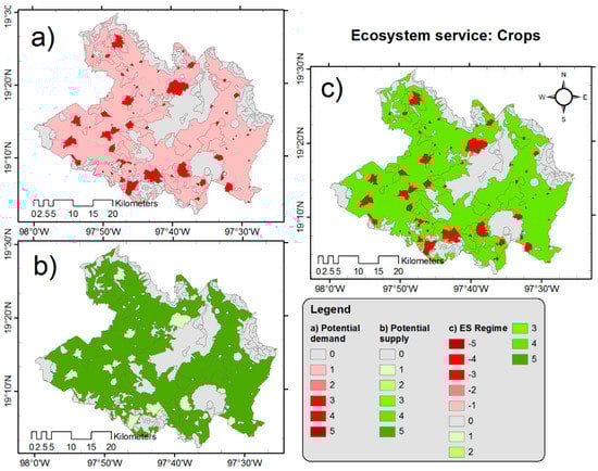 Demand (a), supply (b), and budget (c) of ecosystem service “crops”, according to the land-use/land-cover matrix assessment by Burkhard et al. [40]. Prepared by the authors with information from INEGI [31].