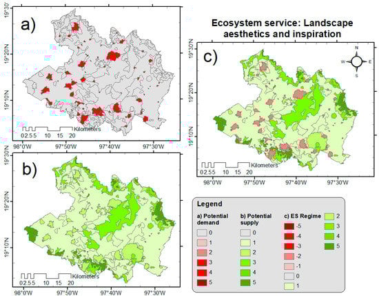 Demand (a), supply (b), and budget (c) of ecosystem service “landscape aesthetics and inspiration”, according to the land-use/land-cover matrix assessment by Burkhard et al. [40]. Prepared by the authors with information from INEGI [31].