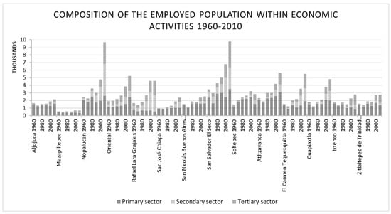 Figure 8 shows demographic and economic changes that can be discerned in the region surrounding San José Chiapa from 1960 to 2010. These are: (1) a reduction in the population participating in the primary sector caused either by migration or displacement, as observed by Lopez et al. [63], which is related to the growth of urban areas as was observed in the aforementioned studies and Tobias [64]; (2) the fact that participation in secondary sector activities has been growing and will continue to grow as foreigners keep moving to the region to work in the newly established manufacturing companies as has been reported in the news [65,66,67]; and (3) the fact that the tertiary sector is growing and will incorporate local people who are not working in automotive enterprises [68,69,70] given that it does not require either land productivity or specialized education.