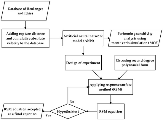 Then, the design of experiment (DOE) is conducted to cover all of the ranges of parameters by points. The ANN model is applied to estimate the target of DOE sample points. Subsequently, the response surface method (RSM), which is a novel method regarding risk assessment and the hazard analysis of liquefaction, is used to establish a direct equation to evaluate the triggering of liquefaction instead of using CRR and CSR. This makes is easier for engineers and contractors to use. Finally, due to uncertainties in soil properties and earthquake parameters, on the basis of the ANN model that was developed in this study and through Monte Carlo simulation (MCS), sensitivity analysis is performed to show the effect of the parameters and their uncertainties on the potential of liquefaction in sandy soils. In Section 8, the proposed model to evaluate the potential for liquefaction triggering (PL) is described. The developed ANN and RSM models are presented in Section 9. The capability and accuracy of the models are confirmed by comparing their results with three extra well-known models. Finally, the sensitivity analysis results are illustrated in 10 graphs. Figure 1 illustrates the flowchart of the risk assessment performed in this study to evaluate PL and conducting sensitivity analysis.