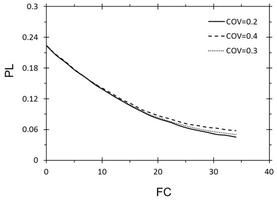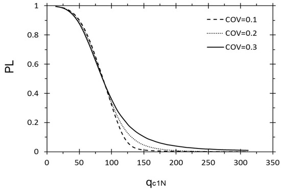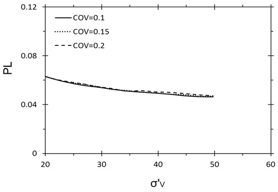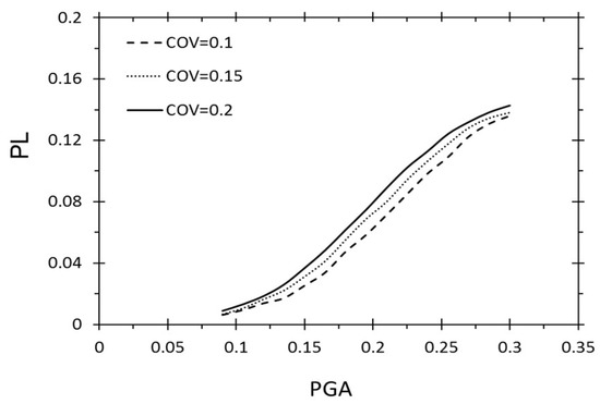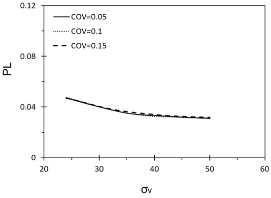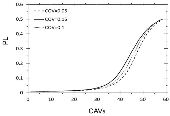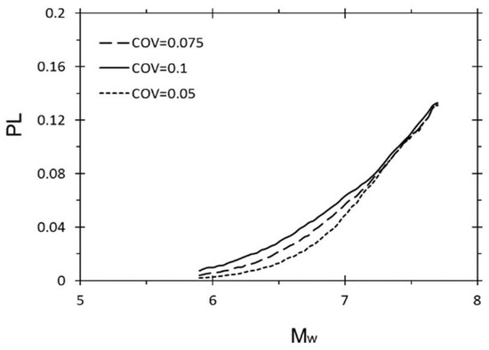 Figure 8 and Figure 9 illustrate the negligible influence of uncertainties of σv and σv’ on PL. Whereas, when CAV5 is in the critical range from 40 m/s to 50 m/s, as shown in Figure 5, by increasing the COV by 10%, from 5% to 15%, the PL increases by around 8%. It is clear that this parameter provides a large effect on the PL by causing it to increase by 50% in the range of the presented CAV5 in the dataset. Furthermore, when the PGA grows from 0.1 to 0.3, the PL shows 14% growth. By a 10% increase in COV, the results illustrate around a 1.5% growth in PL, as demonstrated in Figure 3. As Mw goes up from 5.9 to 7.7, the PL shows an increase from 0% to 14%. Furthermore, for a magnitude of around 6.8, the uncertainty affected in the maximum increases by around 1% by increasing any 2.5% in the COV (Figure 2).