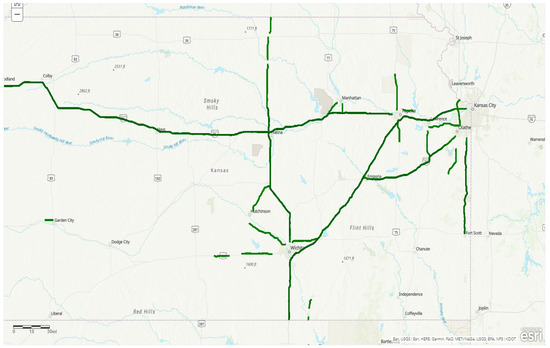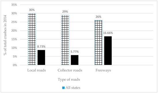 A report released by the U.S. National Transportation Safety Board (NTSB) examined the reasons for speeding-related passenger vehicle crashes. The NTSB found that 16.66% out of 26% of total fatal crashes on freeways are related to speeding in Kansas in the year 2014 (Figure 1). This means that speeding has become a significant contributing factor in fatal crashes, specifically on freeways compared to other types of roadways in recent years for the state of Kansas [2]. Similarly, increasing the speed limit could influence the crash severity and may result in a higher number of fatal crashes. Accordingly, the purpose of this study was to assess the safety consequences of the roadways related to the speed limit increase. The three different before-and-after studies identified by the Highway Safety Manual [3] are: Observational before/after evaluation studies (simple before/after study), observational before/after evaluation studies using the Safety Performance Functions (SPFs)—the Empirical Bayes (EB) method, and observational before/after evaluation study using the comparison group method. The before-and-after study with comparison group method was utilized in this study to determine the impact of speed limit change on the number of crashes on freeways. This method also considers information about non-treated sections, on which the speed limit did not change, making it a more reasonable methodology to evaluate safety effectiveness.