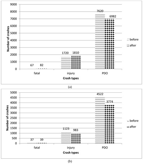 Observed crashes for treated and non-treated sites during before/after periods. (a) Fatal, Injury, and property damage only (PDO) crashes for treated sections in the before and after periods; (b) Fatal, Injury, and PDO crashes for non-treated sections in the before and after periods.