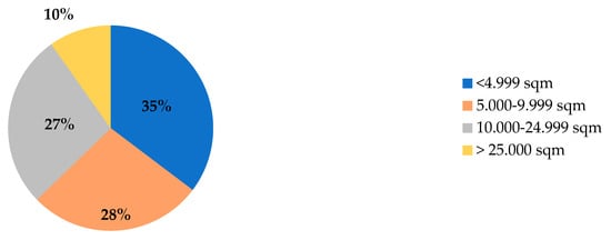 Descriptive statistics of the 55 transactions of the sample are provided. Almost two thirds (64%) of the transactions took place in the CBD area (35 cases) while 36% of the other transactions took place in the district of Porta Nuova (20 cases). Real estate developments reflect a general trend we found in Milan: 74% of the transactions concern refurbishments while 26% are new constructions. The size of the leased properties varies within the sample. Roughly a third (35%) of the assets (18 cases) have a surface area between 2000 and 5000 square meters while the upper size classes (between 5000 and 9999 square meters and between 10,000 and 24,999 square meters) are just over half of the sample. Finally, 10% of the sample refers to surfaces of more than 25,000 square meters, as shown in Figure 1.