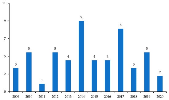 Properties of the sample hit the market over a period of time from 2009 to the present day. A fraction of the sample (7 properties) is still under development and is expected to be put on the market by 2020. The mode and the median of this sample coincide and are located at the center of the time period under examination (2014), as shown in Figure 2.