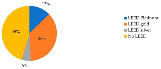 For the purpose of this research, we decided to investigate LEED-certified buildings, which represent the most widespread type of green certified buildings in Italy. LEED building’s energy and environmental certification system was developed by the U.S. Green Building Council (USGBC) in the 1990s. It is a tool for measuring the level of sustainability of buildings, neighborhoods, and cities in the design, construction, and management phases. LEED is a voluntary, market-oriented tool based on the consensus of the USGBC community. LEED certification proposes a measurement system (rating) applicable to buildings with different uses, both for existing and new assets. This is based on principles commonly recognized and accepted by the national scientific community [10,15,16].