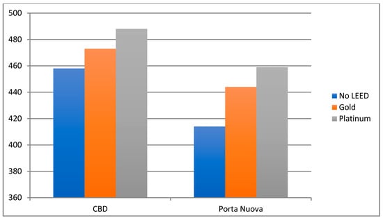 The two hedonic prices—relating to the location of buildings and the type of LEED certification—define the market value of these two variables. LEED certification rewards properties according to their performance: the premium price for the position in the traditional CBD amounts to 44 Euro/sqm/year, while the hedonic price related to the type of certification amounts to 15 Euro/sqm/year (see Table 4 and Figure 5). The model shows that the increase in the hedonic price related to the building’s environmental quality amounts to 3.69% for each step of the LEED certification. The Silver level does not prove to be statistically significant because of the limited amount of transactions. With a Gold certification, the market value increase amounts to 7.38%, while the Platinum level determines an increase of 11.08%.