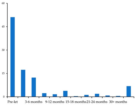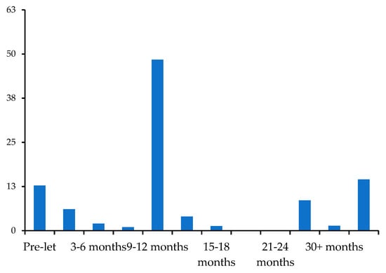 Regarding non-certified buildings, pre-let leases amount to only 13%. After six months, leased areas amount to 21% of the total supply. After two years and a half, the vacancy rate amounts to more than 14% (see Figure 8 and Figure 9).