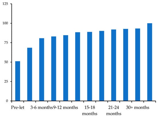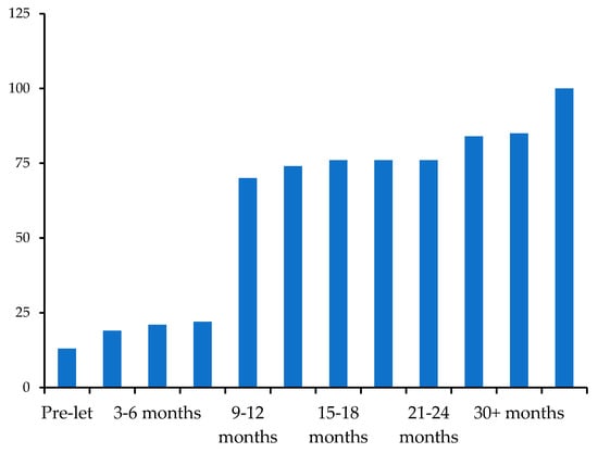 Data concerning this subsample allowed to investigate the absorption times of each building. The rentals recorded on a quarterly basis up to 30 months were examined and the actual leased surface area was measured. The analysis of relative and absolute frequencies revealed a clear preference for certified buildings. As shown in Figure 6 and Figure 7, the 51%, of the surface area of certified buildings is already pre-let. Within six months of the completion of the intervention, the leased areas amount about to 80% of the available supply. After two and a half years from the placing on the market, the vacancy rate amounts to a percentage of about 7%.